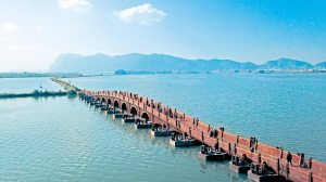 東風壩整治修復工程位于滇池草海北片區(qū),北接新運糧河旁的環(huán)滇池綠道,西通高峣立交王家堆濕地。工程道路全長3450米,步道寬2米至4米。其中,七孔浮橋長130米,橋面寬3.6米,結(jié)構(gòu)為鋼結(jié)構(gòu),設(shè)計取意源于昆明古八景之一的“云津夜市”,靈感來自昆明??诖ㄗ珠l橋墩,保留了古典橋梁的美感。連接七孔浮橋與環(huán)滇池綠道的生態(tài)走廊,新建照明和監(jiān)控系統(tǒng),沿線設(shè)置避雨亭、景觀石、石籠坐凳和木樁坐凳等便民設(shè)施,提升了景觀效果,方便游客休閑觀光。