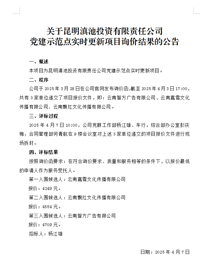 關(guān)于昆明滇池投資有限責(zé)任公司黨建示范點(diǎn)實(shí)時更新項(xiàng)目詢價結(jié)果的公告