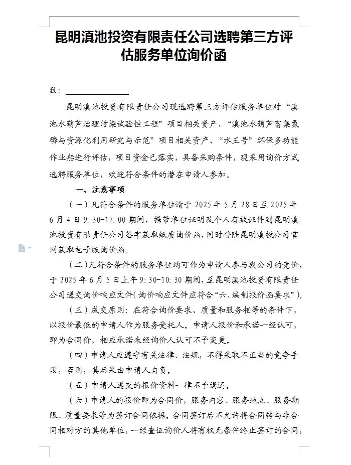 昆明滇池投資有限責(zé)任公司選聘第三方評估服務(wù)單位詢價函