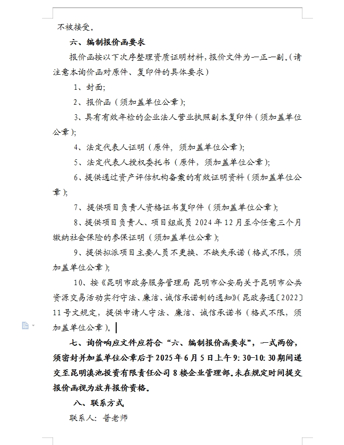 首頁>信息公開>昆明滇池投資有限責(zé)任公司選聘第三方評估服務(wù)單位詢價函