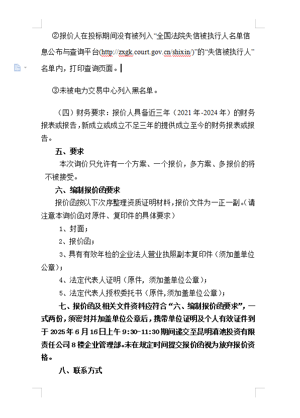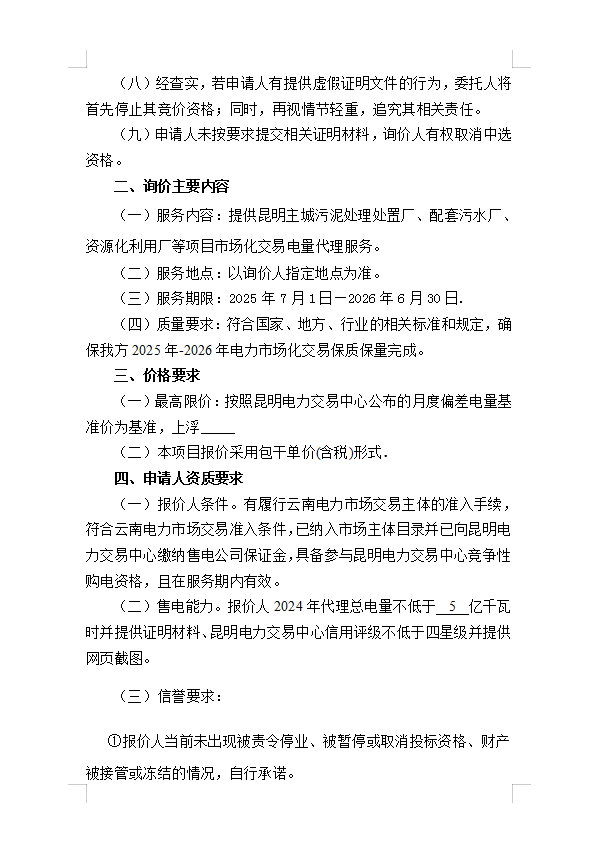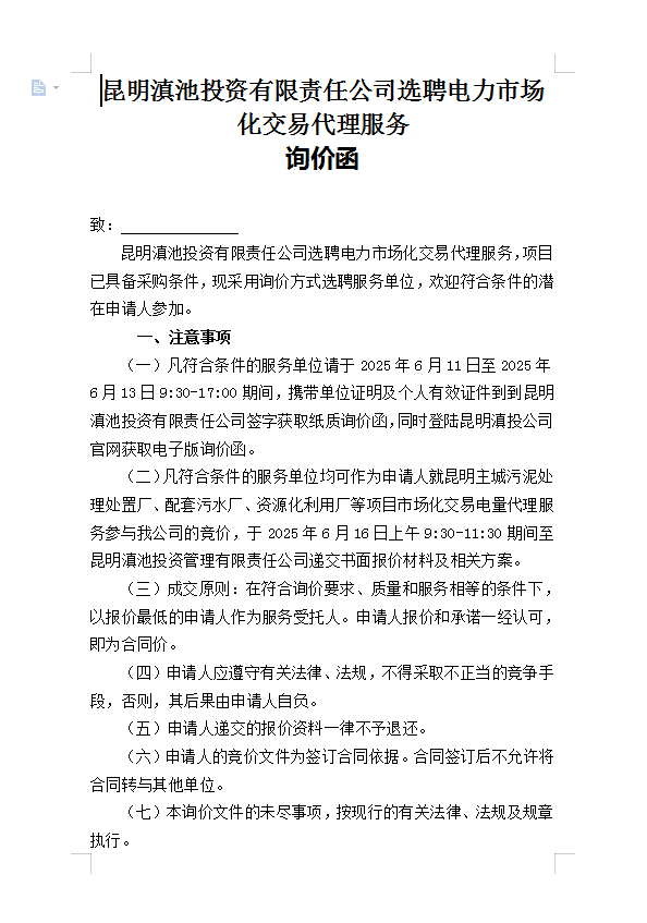 首頁(yè)>信息公開(kāi)>昆明滇池投資有限責(zé)任公司選聘電力市場(chǎng)化交易代理服務(wù)詢價(jià)函