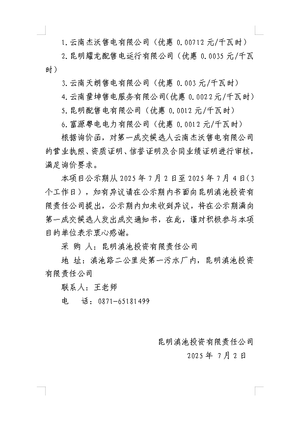 昆明滇池投資有限責(zé)任公司關(guān)于選聘富民污泥廠電力市場化交易第三方服務(wù)單位詢價結(jié)果的公示