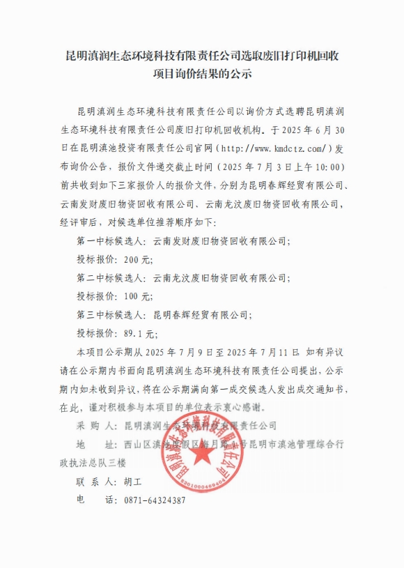 昆明滇潤(rùn)生態(tài)環(huán)境科技有限責(zé)任公司選取廢舊打印機(jī)回收項(xiàng)目詢價(jià)結(jié)果的公示