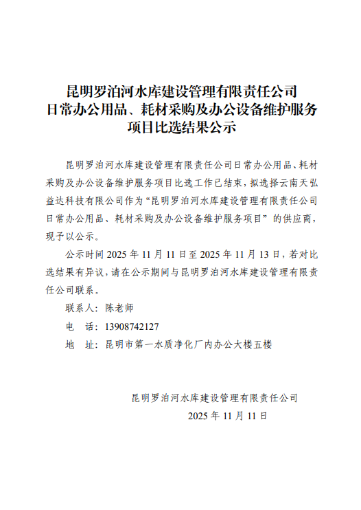 昆明羅泊河水庫(kù)建設(shè)管理有限責(zé)任公司日常辦公用品、耗材采購(gòu)及辦公設(shè)備維護(hù)服務(wù)項(xiàng)目比選結(jié)果公示