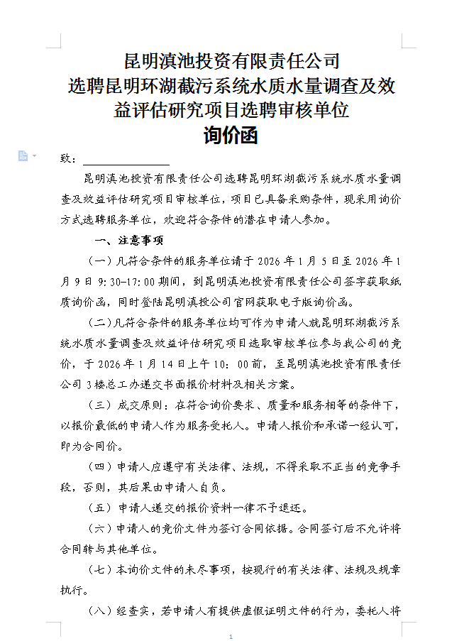 昆明滇池投資有限責(zé)任公司選聘昆明環(huán)湖截污系統(tǒng)水質(zhì)水量調(diào)查及效益評(píng)估研究項(xiàng)目選聘審核單位詢價(jià)函
