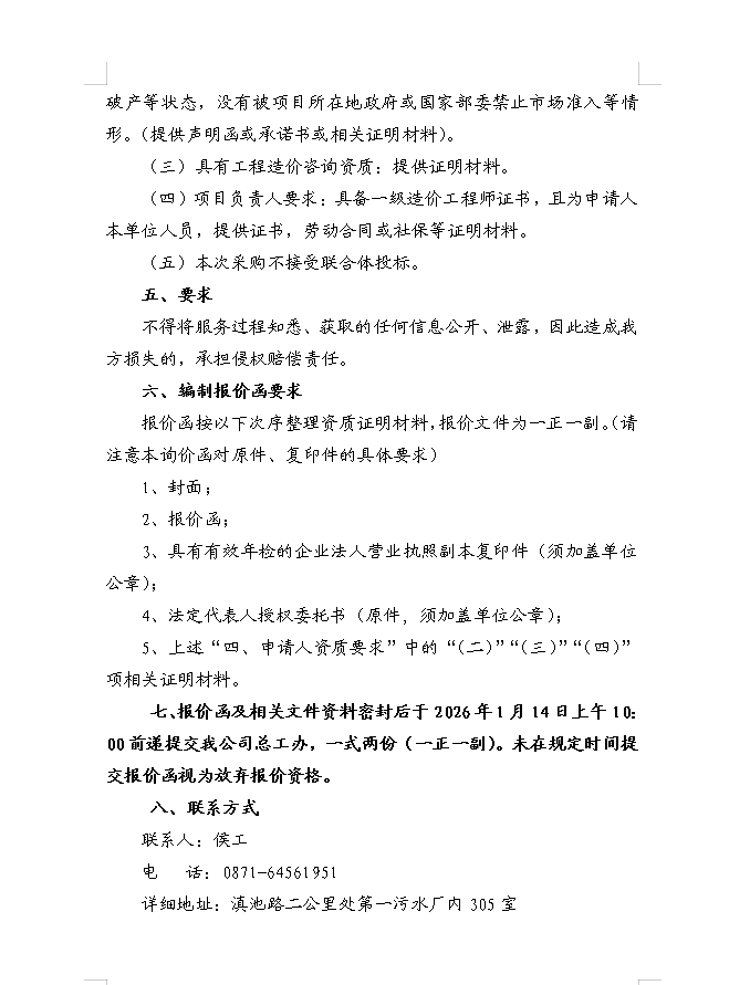 首頁(yè)>信息公開(kāi)>昆明滇池投資有限責(zé)任公司選聘昆明環(huán)湖截污系統(tǒng)水質(zhì)水量調(diào)查及效益評(píng)估研究項(xiàng)目選聘審核單位詢價(jià)函